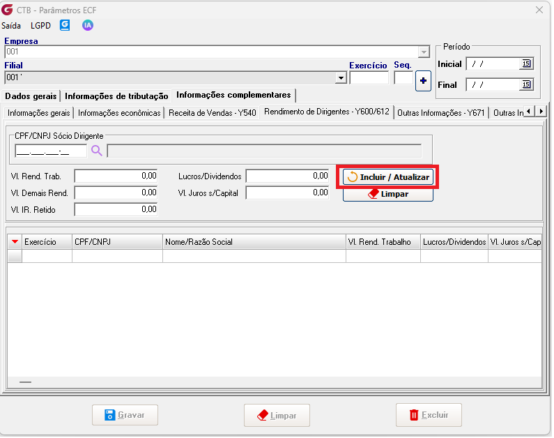 Observação: Se tiver as informações dos sócios no cadastro de parâmetros do módulo clicar em Incluir/atualizar que o sistema busca a informação para o parâmetro do ECF.