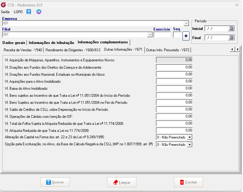 Observação: Os campos: Indicador de Recolhimento da Receita, Forma de tributação do período, Tipo de escrituração, Opções de Imune ou Isento e Forma de determinação das estimativas mensais serão habilitados ou desabilitados de acordo com a opção informada na Forma de tributação do lucro e Período de apuração do IRPJ e CSLL.