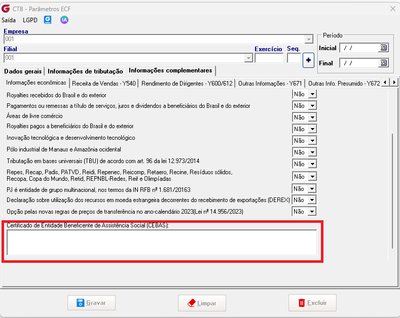 Observação: A partir da declaração do exercício de 2025, entidades isentas e imunes nas áreas de assistência social, saúde ou educação que atendam aos requisitos de possuírem CEBAS (Certificado de Entidade Beneficente de Assistência Social), devem informar o número obrigatoriamente.