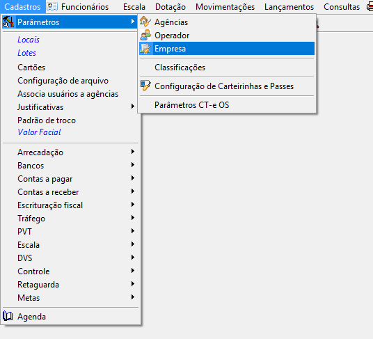 Passo 1: Acesso o menu Cadastros > Parâmetros > Empresa e informe a empresa e filial que deseja parametrizar.