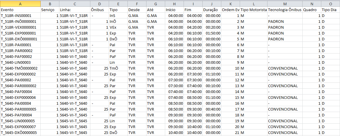 | Lin | Troca de Linha | Evento sem duração que indica a mudança de linha dum ônibus e/ou motorista/cobrador |