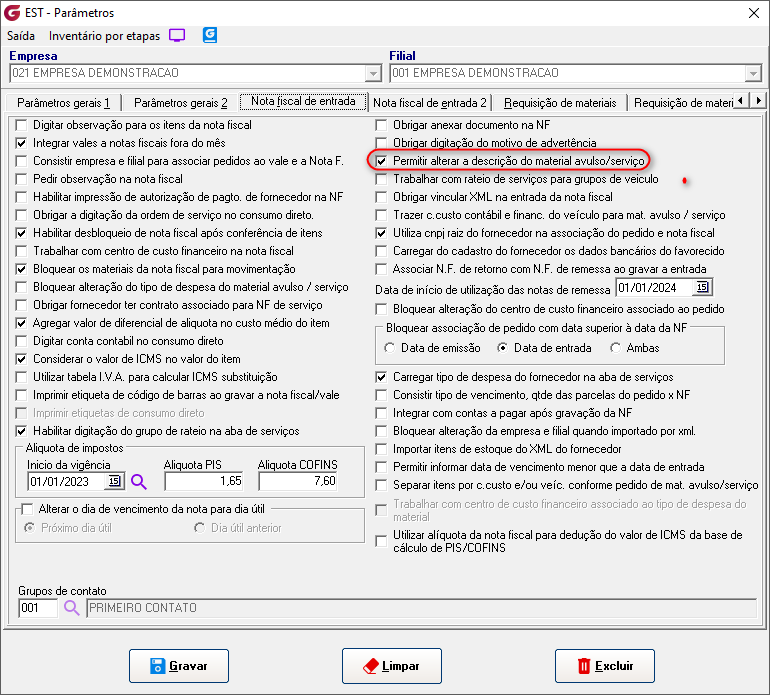 Caminho de acesso: >Pedido>Manual/manutenção >Pedido>Aprovação>Material avulso Módulo (EST) >Parâmetros>Estoque>Nota fiscal de entrada |