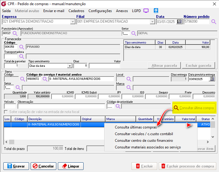 Pedido>Aprovação>Material avulso Na tela de aprovação de material avulso/serviço é possível visualizar as últimas compras, clicando com o botão direito do mouse sobre o item no grid, na opção consulta últimas compras.