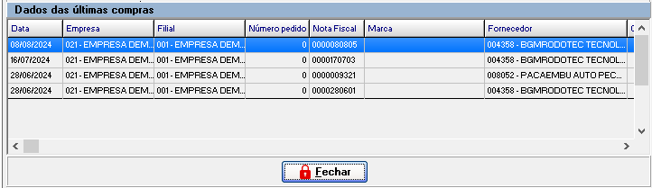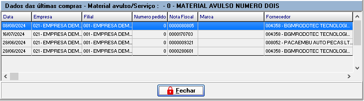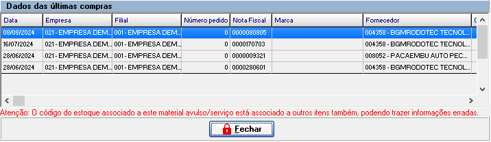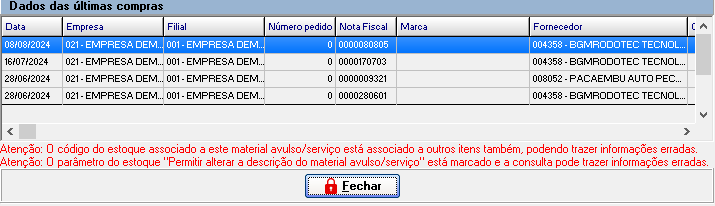 Implementada rotina para apresentação de últimas compras de material avulso/serviço; Incluída mensagem informativa ao usuário quando o parâmetro "Permitir alterar a descrição do material avulso/serviço" do módulo de estoque está marcado e quando o código do material avulso/serviço do estoque está associado a mais de um material avulso/serviço do módulo de compras. Estoque>Parâmetros>Estoque>Nota fiscal de entrada Parâmetro do estoque que define se o material avulso/serviço pode ser alterado no lançamento da nota fiscal.