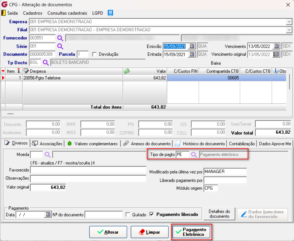 No parâmetro informei um tipo de documento que tem forma de contabilização Baixa: