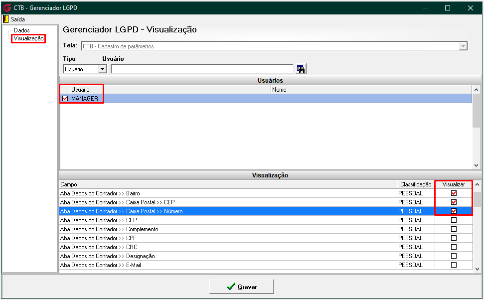 No menu Gerenciador, o responsável poderá configurar a classificação e a visibilidade de cada campo da tela. Serão exibidos todos os campos que possuem ser pessoais e/ou sensíveis, permitindo ao usuário autorizado gerenciar essas configurações conforme necessário, inclusive personalizando as permissões de visualização por usuário ou grupo.