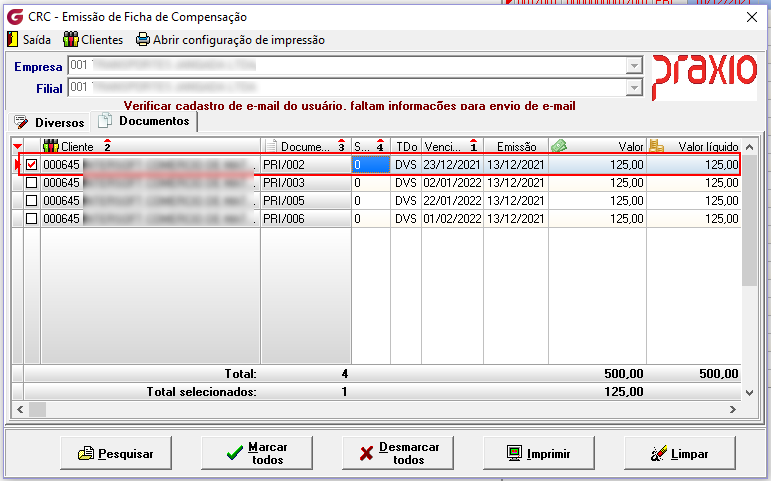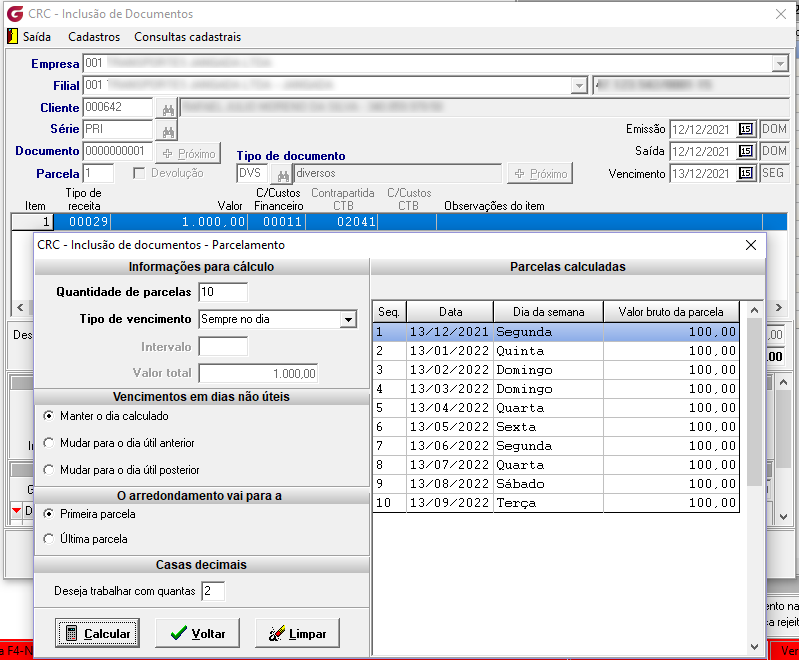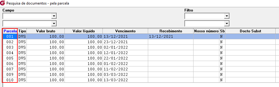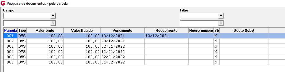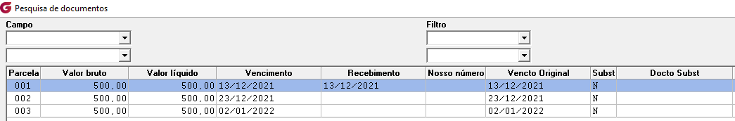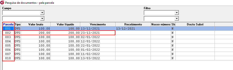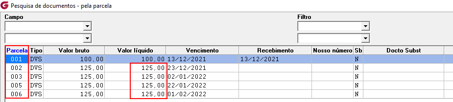 Passo 5: A primeira parcela do documento foi recebido e as demais parcelas estão em aberto