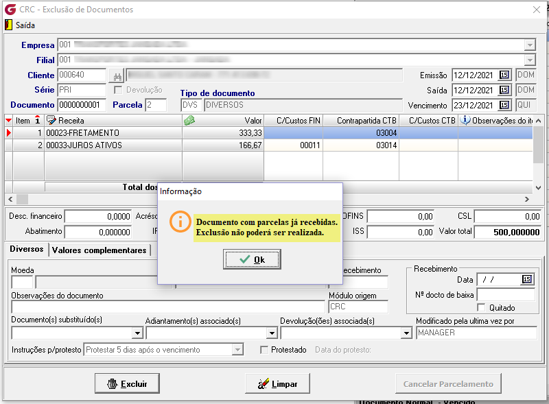 Passo 3: Na tela de exclusão ao solicitar a exclusão de uma parcela do documento acima é apresentada a mensagem de que o documento já tem parcelas recebidas e não será possível a exclusão.