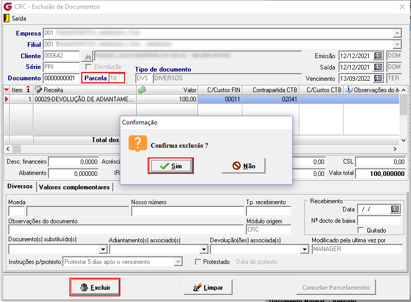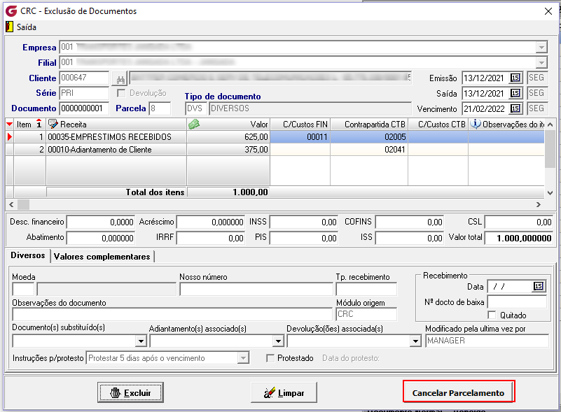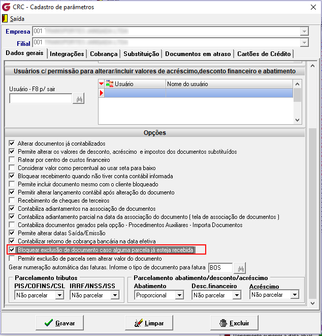 *Com ou Sem as flags marcadas o sistema não permite a exclusão de parcelas que estejam em cobrança eletrônica ou que sejam parcelas de documentos substituídos.