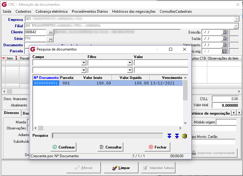 Consultando o documento na tela de alteração percebemos que a parcela 1 que estava recebida permanece inalterada e todas as demais que estavam em aberto foram excluídas.