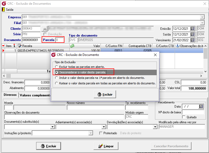 - Desconsiderar o valor desta parcela: O sistema irá excluir esta parcela e irá manter as outras inalteradas.
