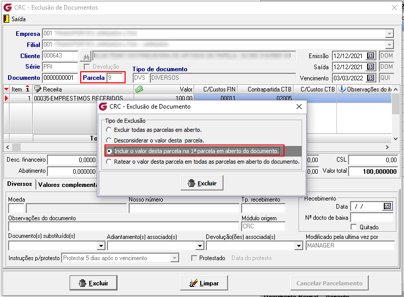 - Incluir o valor desta parcela na 1ª parcela em aberto do documento: O sistema irá excluir essa parcela e irá somar o valor da mesma na 1ª parcela em aberto do documento.