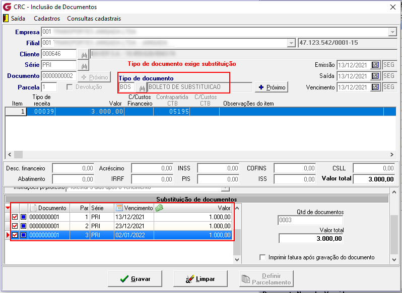 Foi incluído um documento que substituiu 3 parcelas de outro documento: