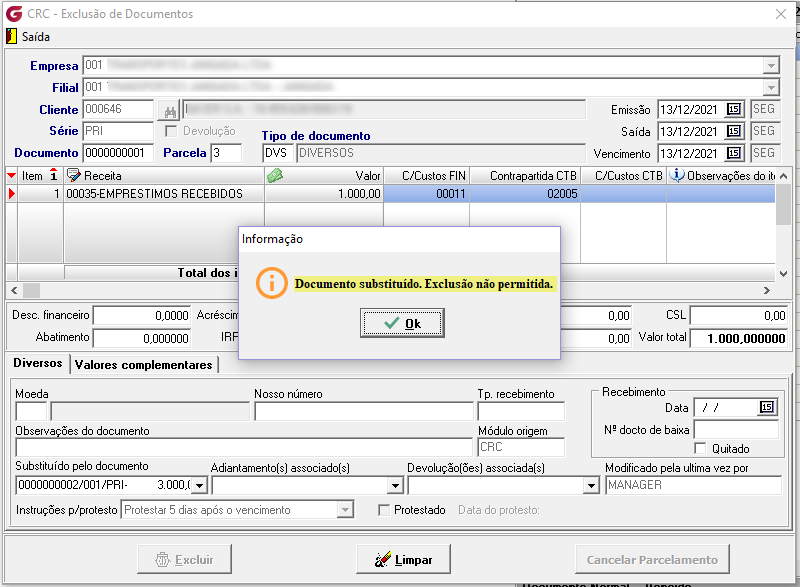 O sistema também não permite excluir parcelas de documentos substituídos: