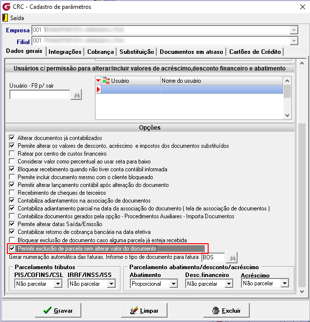 Passo 1: Marco a flag "Permitir a exclusão de parcela sem alterar valor do documento"