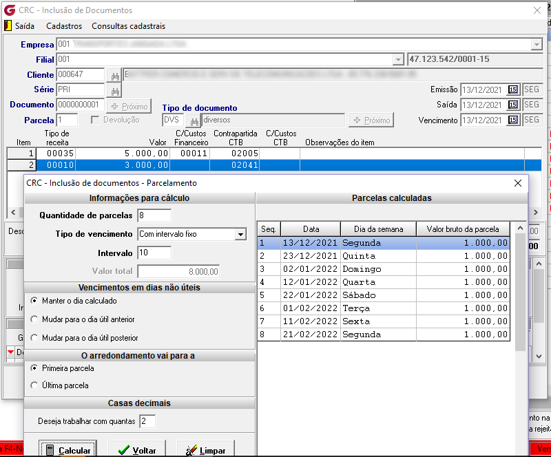 Passo 2: Foi incluído um documento no valor de 8.000,00 e dividido em 8x, porém neste caso o documento ainda não foi recebido nenhuma parcela: