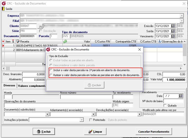 Sem nenhuma flag marcada, o sistema permite a exclusão de parcelas dando 4 opções de exclusão, tanto para documentos que estejam totalmente em aberto quanto para documentos que estejam parcialmente recebidos.