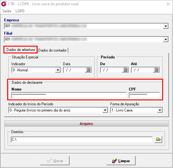 Todos os campos identificados na tela de LCDPR - Livro caixa do produtor rural como contendo dados pessoais ou sensíveis de Pessoa Física (PF) estarão sujeitos às regras de visualização a partir da data definida no parâmetro 'Ativar a LGPD'. A exibição ou ocultação desses campos dependerá da classificação aplicada no Gerenciador LGPD.
