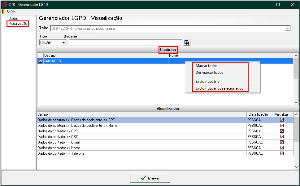 No menu Gerenciador, o responsável poderá configurar a classificação e a visibilidade de cada campo da tela. Serão exibidos todos os campos que possuem ser pessoais e/ou sensíveis, permitindo ao usuário autorizado gerenciar essas configurações conforme necessário, inclusive personalizando as permissões de visualização por usuário ou grupo.