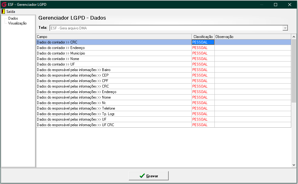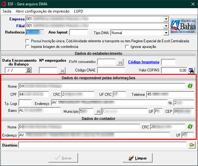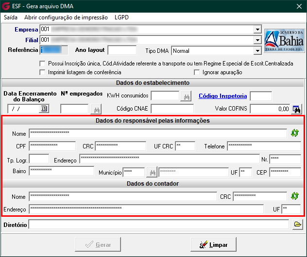 Todos os campos identificados na tela de Gera arquivo DMA como contendo dados pessoais ou sensíveis de Pessoa Física (PF) estarão sujeitos às regras de visualização a partir da data definida no parâmetro 'Ativar a LGPD'. A exibição ou ocultação desses campos dependerá da classificação aplicada no Gerenciador LGPD.