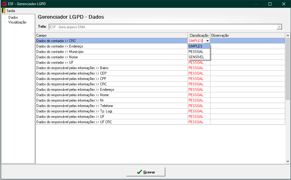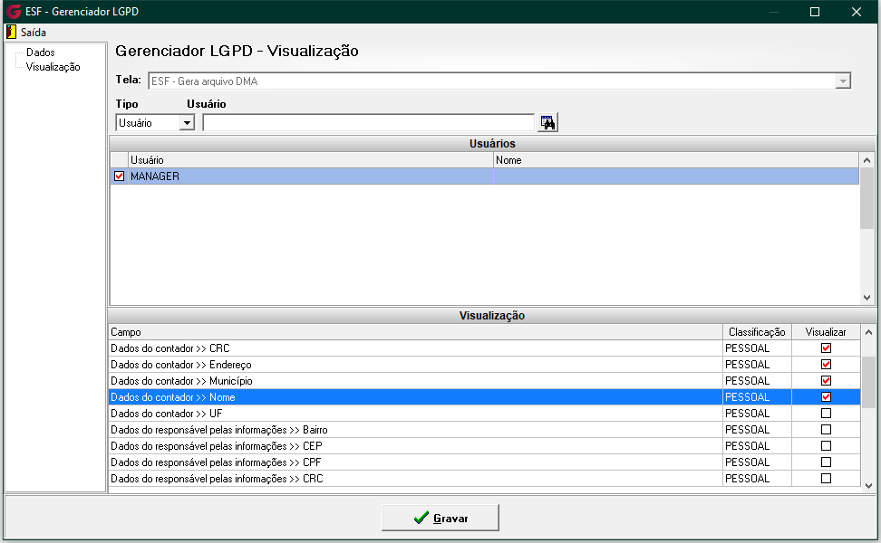 No menu Gerenciador, o responsável poderá configurar a classificação e a visibilidade de cada campo da tela. Serão exibidos todos os campos que possuem ser pessoais e/ou sensíveis, permitindo ao usuário autorizado gerenciar essas configurações conforme necessário, inclusive personalizando as permissões de visualização por usuário ou grupo.