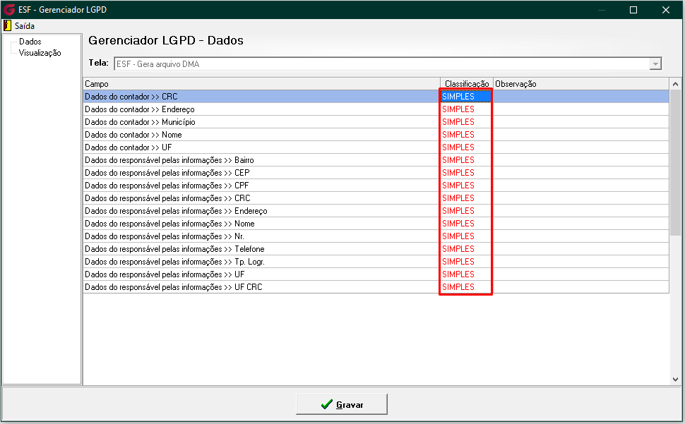Sempre que escolher aplicar SIMPLES para todos na opção Aplicar Classificação para todos, na Aba Dados, deverá clicar no botão Gravar: