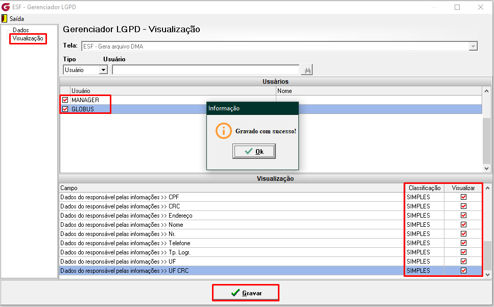 Após essa configuração, na aba Visualização, será possível verificar que todos os usuários selecionados terão a visualização ativa para os campos classificados como SIMPLES na aba "Dados".