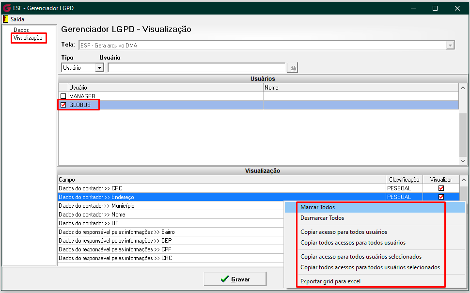 - Marcar Todos – marca o botão visualizar de todos os campos do grid para o usuário.