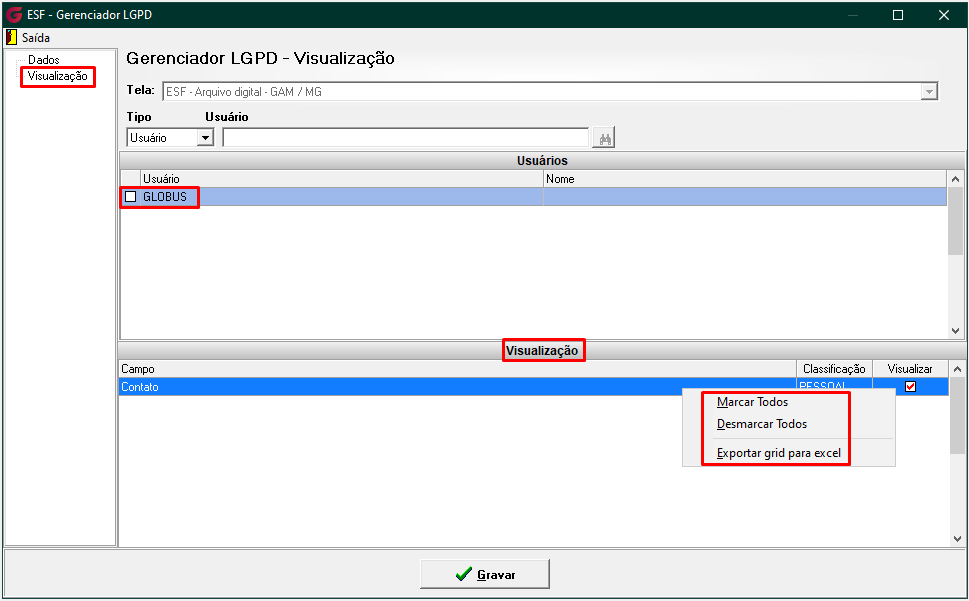 - Marcar Todos – marca o botão visualizar de todos os campos do grid para o usuário.