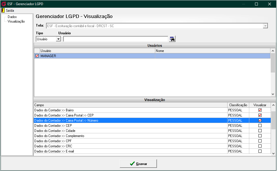No menu Gerenciador, o responsável poderá configurar a classificação e a visibilidade de cada campo da tela. Serão exibidos todos os campos que possuem ser pessoais e/ou sensíveis, permitindo ao usuário autorizado gerenciar essas configurações conforme necessário, inclusive personalizando as permissões de visualização por usuário ou grupo.
