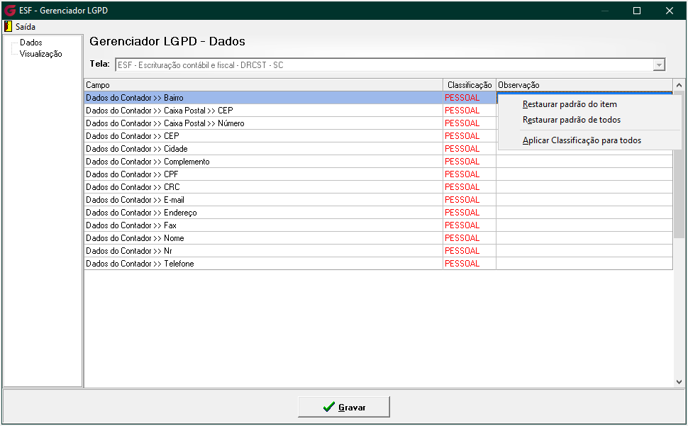 Observação: Neste menu o usuário responsável poderá mudar a classificação e a visualização de cada campo da tela que tenha a adequação da LGPD.