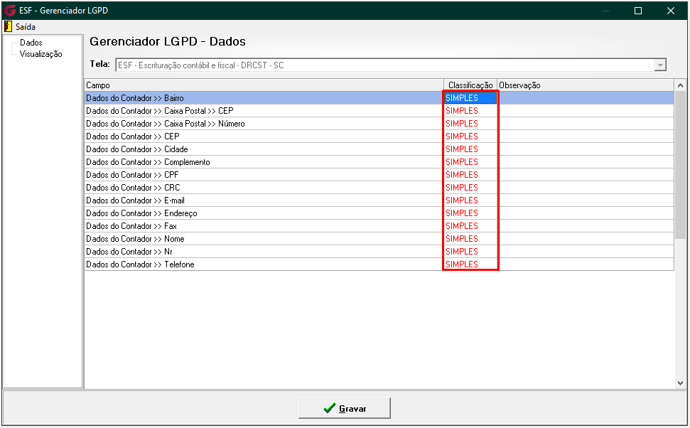 Sempre que escolher aplicar SIMPLES para todos na opção Aplicar Classificação para todos, na Aba Dados, deverá clicar no botão Gravar: