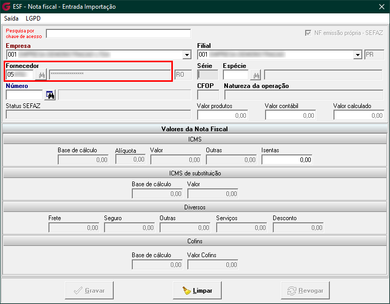 Todos os campos identificados na tela de Nota fiscal - Entrada Importação como contendo dados pessoais ou sensíveis de Pessoa Física (PF) estarão sujeitos às regras de visualização a partir da data definida no parâmetro 'Ativar a LGPD'. A exibição ou ocultação desses campos dependerá da classificação aplicada no Gerenciador LGPD.