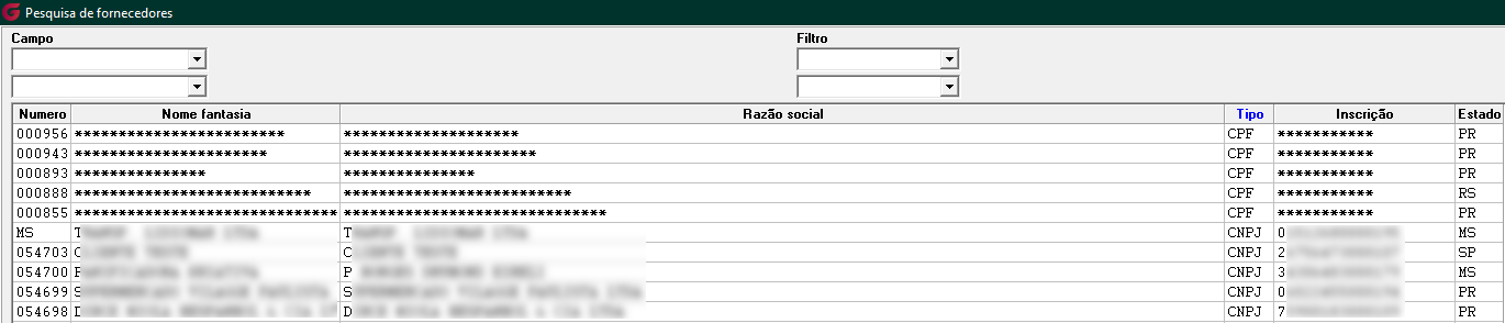 Observação: Para os botões de pesquisa dependendo da informação apresentada no grid, o sistema também ocultará as informações de PF.