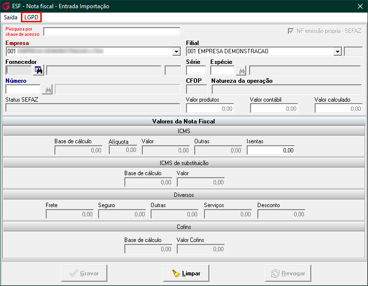 Para configurar as restrições de visualização por campo na tela de Nota fiscal - Entrada Importação, acesse o módulo de Escrituração Fiscal e siga o caminho: Documentos de Entrada > Altera nota importação. Em seguida, clique na aba 'LGPD', localizada no canto superior da tela, conforme a imagem abaixo mostra: