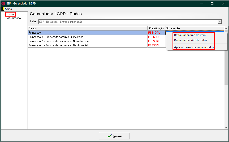 - Restaurar padrão do item – se foi alterado, ao selecionar essa opção o campo volta à classificação padrão Globus.