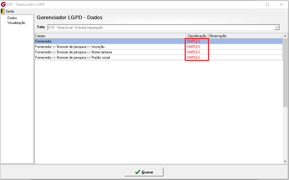 Sempre que escolher aplicar SIMPLES para todos na opção Aplicar Classificação para todos, na Aba Dados, deverá clicar no botão Gravar: