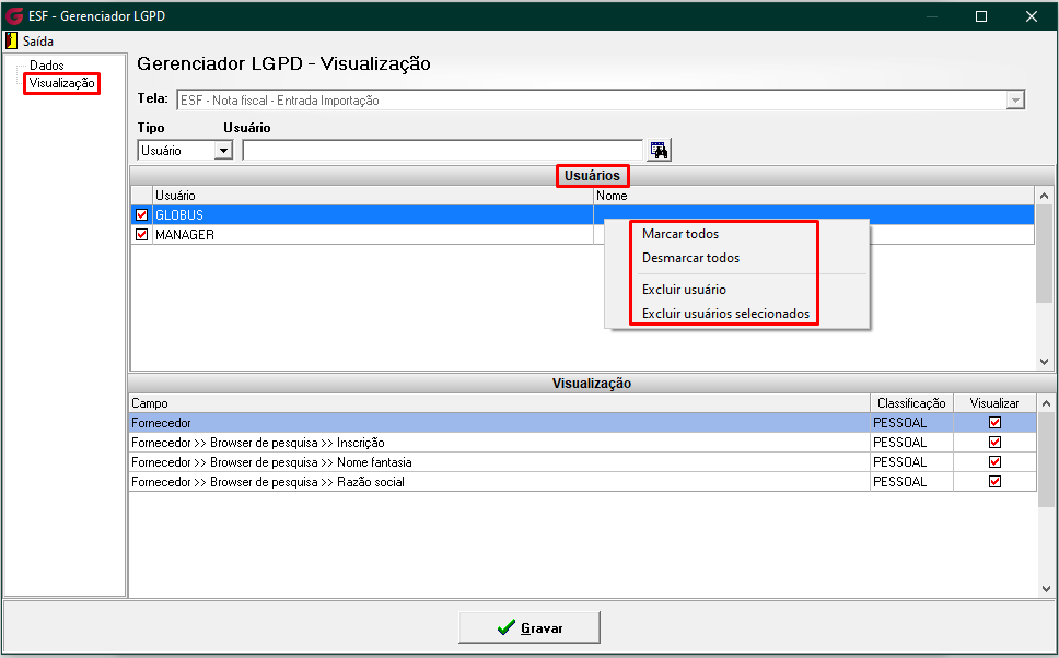 - Excluir usuário – exclui as visualizações alteradas para o usuário marcado e este usuário volta à visualização padrão Globus.