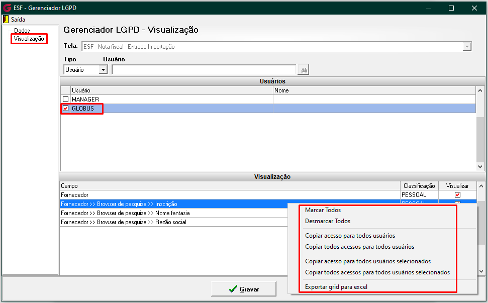 - Marcar Todos – marca o botão visualizar de todos os campos do grid para o usuário.