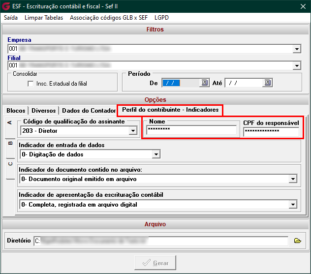 Para configurar as restrições de visualização por campo na tela de Sef II, acesse o módulo de Escrituração Fiscal e siga o caminho: Arquivos digitais > SEF > SEF II. Em seguida, clique na aba 'LGPD', localizada no canto superior da tela, conforme a imagem abaixo mostra: