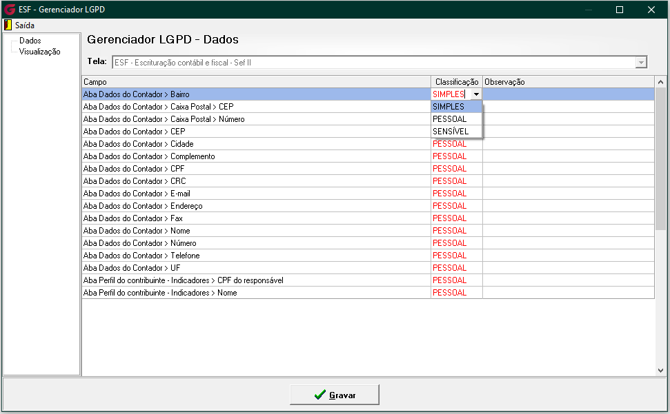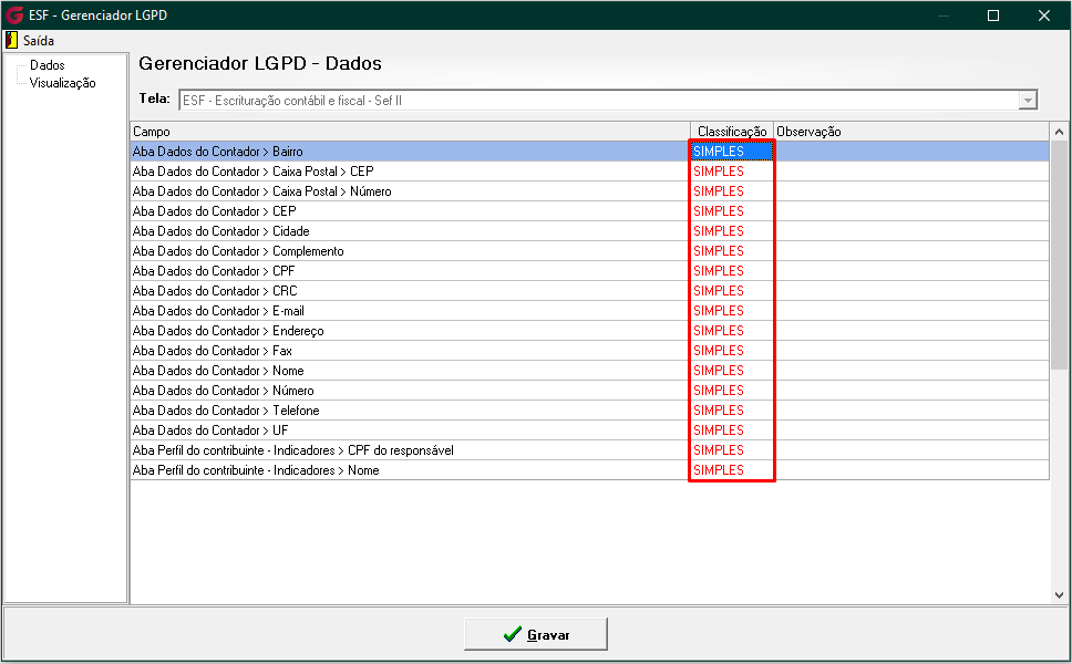 Sempre que escolher aplicar SIMPLES para todos na opção Aplicar Classificação para todos, na Aba Dados, deverá clicar no botão Gravar: