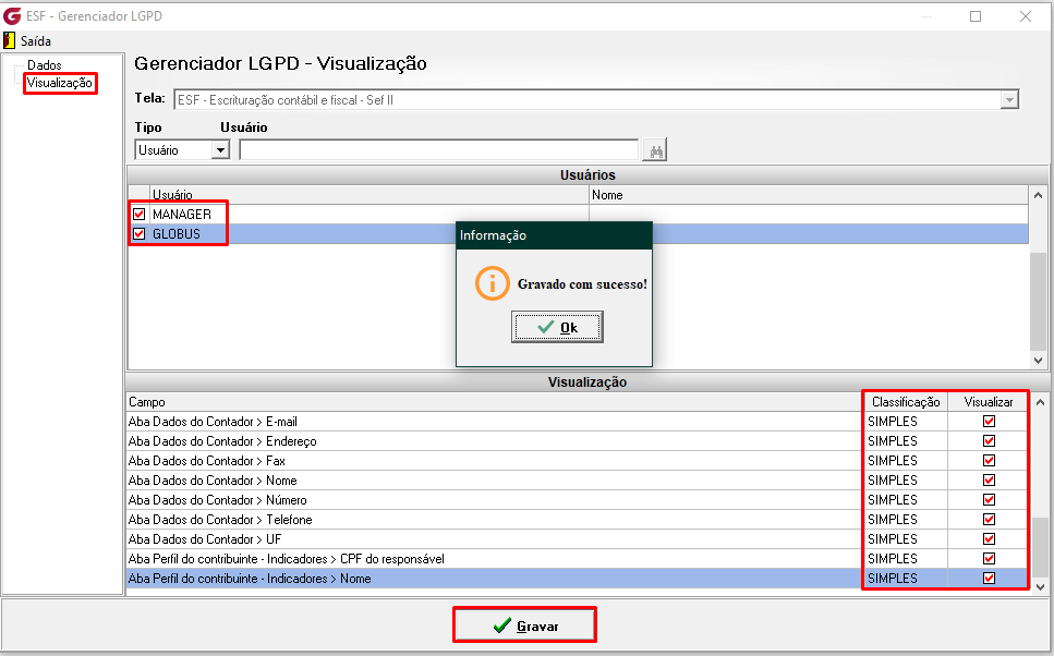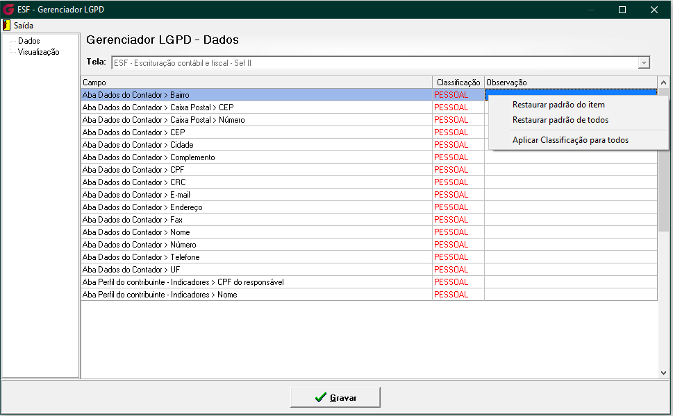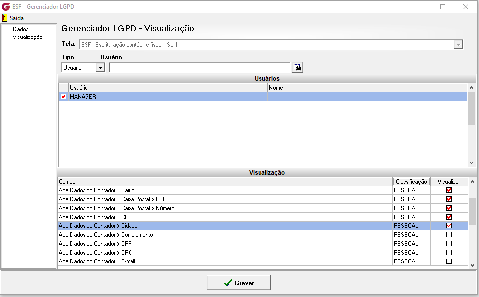 No menu Gerenciador, o responsável poderá configurar a classificação e a visibilidade de cada campo da tela. Serão exibidos todos os campos que possuem ser pessoais e/ou sensíveis, permitindo ao usuário autorizado gerenciar essas configurações conforme necessário, inclusive personalizando as permissões de visualização por usuário ou grupo.