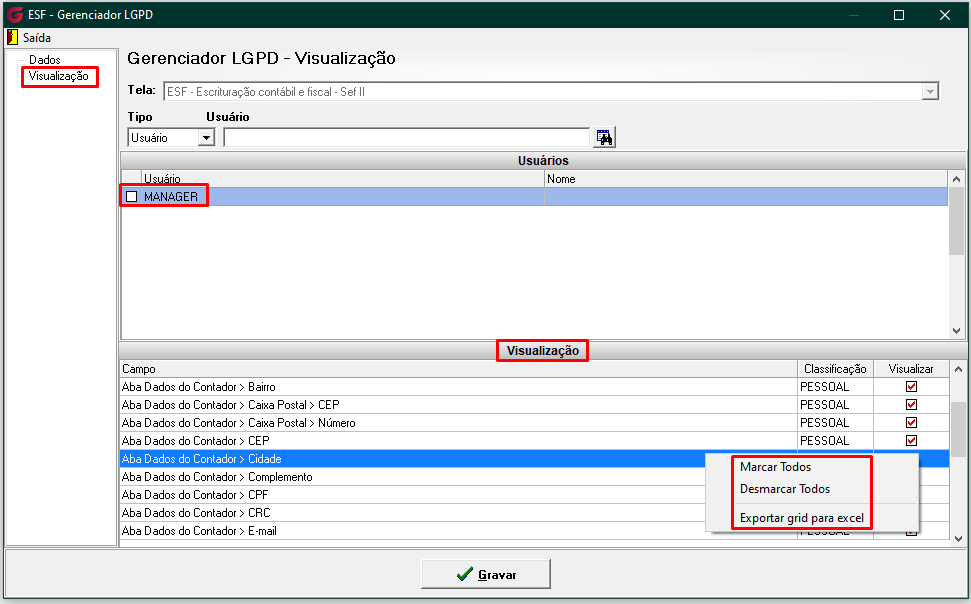 - Marcar Todos – marca o botão visualizar de todos os campos do grid para o usuário.