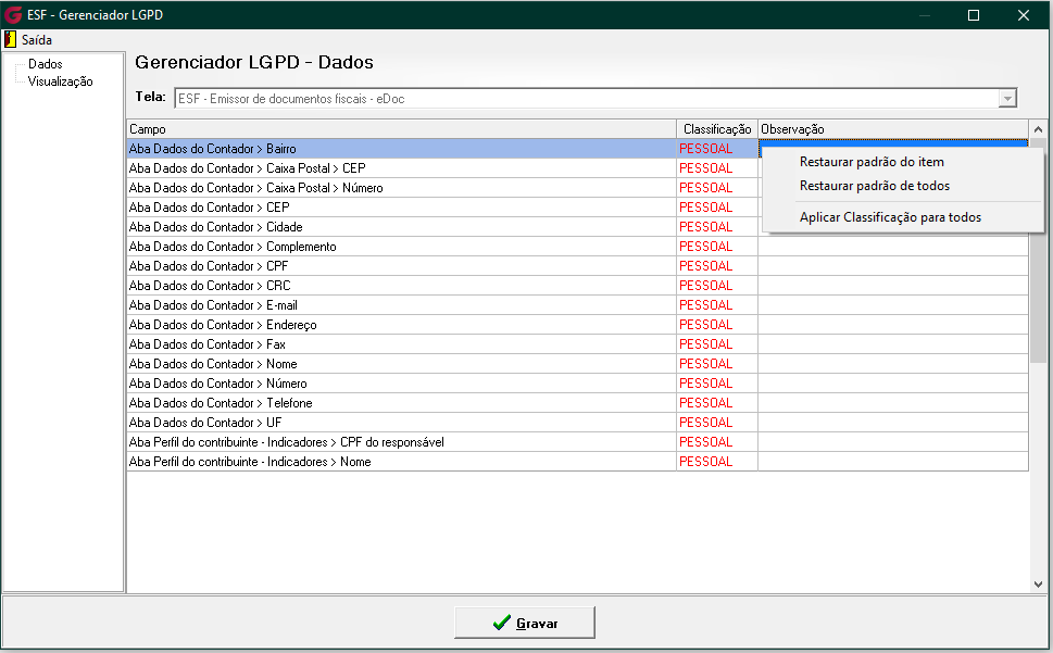 Observação: Neste menu o usuário responsável poderá mudar a classificação e a visualização de cada campo da tela que tenha a adequação da LGPD.