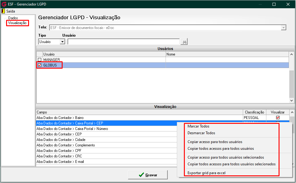 - Marcar Todos – marca o botão visualizar de todos os campos do grid para o usuário.