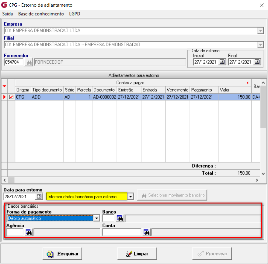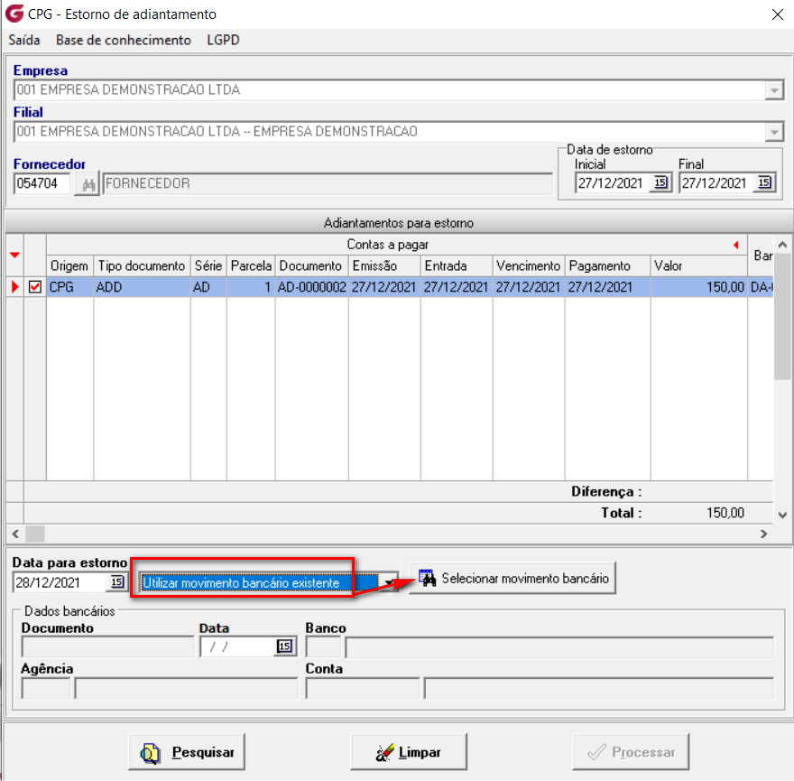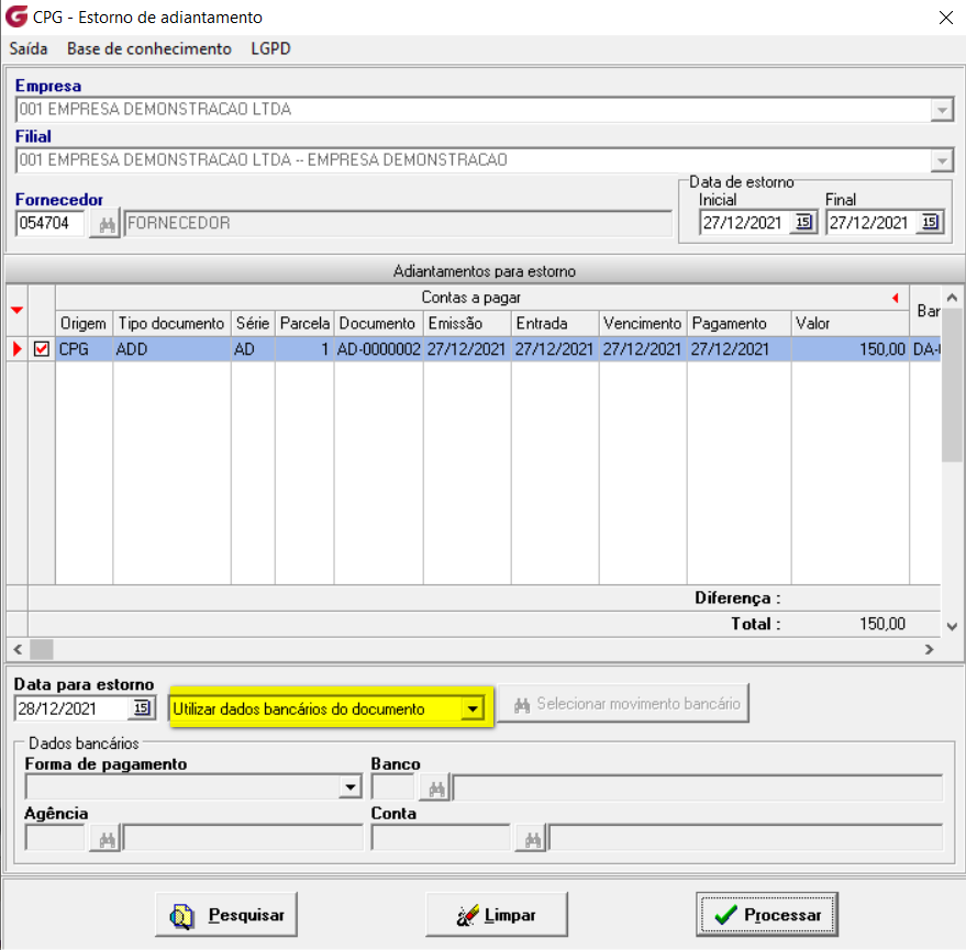 Para esta opção o sistema usa os dados bancários usados na pagamento do adiantamento.
