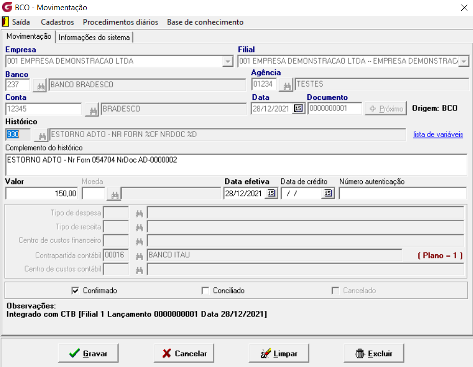 Desde que esteja tudo certo com os parâmetros o estorno é integrado/associado ao banco e contabilidade, na consulta à movimentação no módulo de controle bancário (BCO), fica adicionada a informação de estorno no campo de complemento ao histórico.