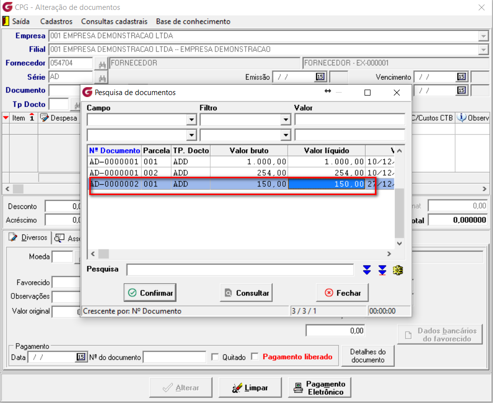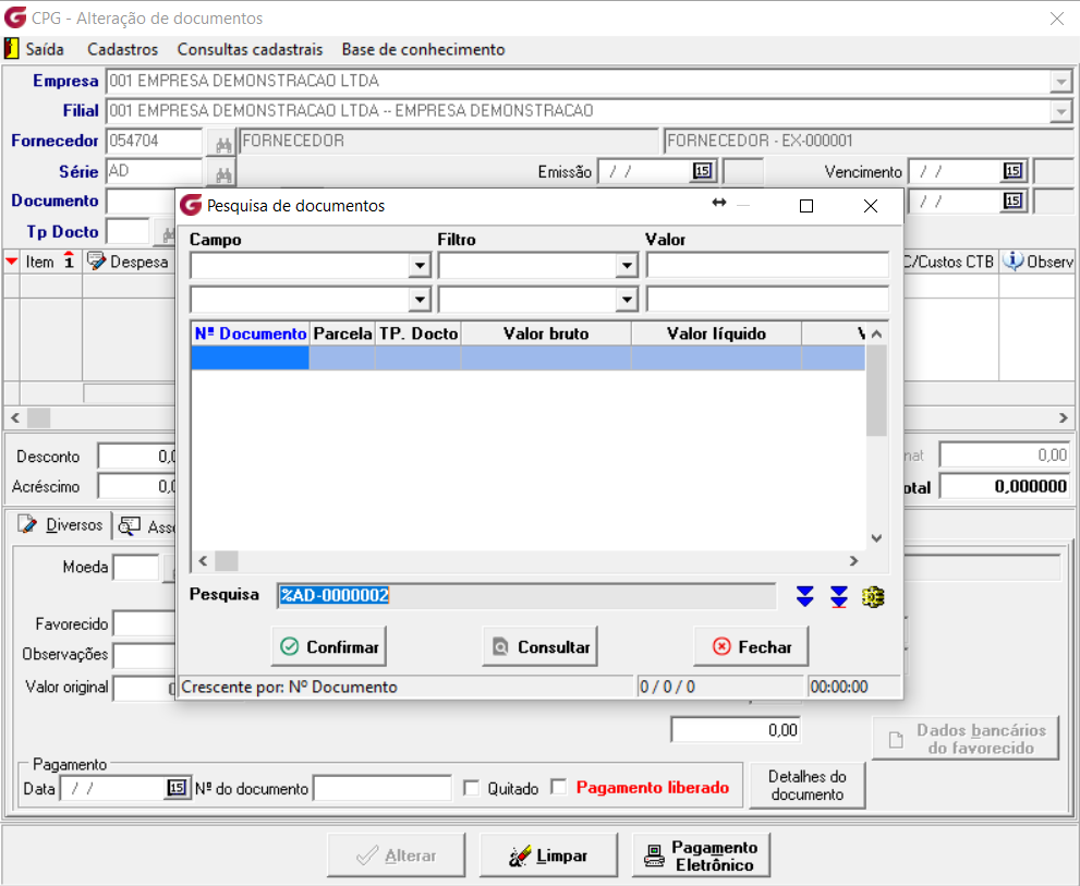 Como exemplo consultamos um adiantamento que não possui associação a nenhuma nota, consta apenas como documento pago, para realizar esta consulta acesse o menu:"Procedimentos Diários>Documentos>Alteração".