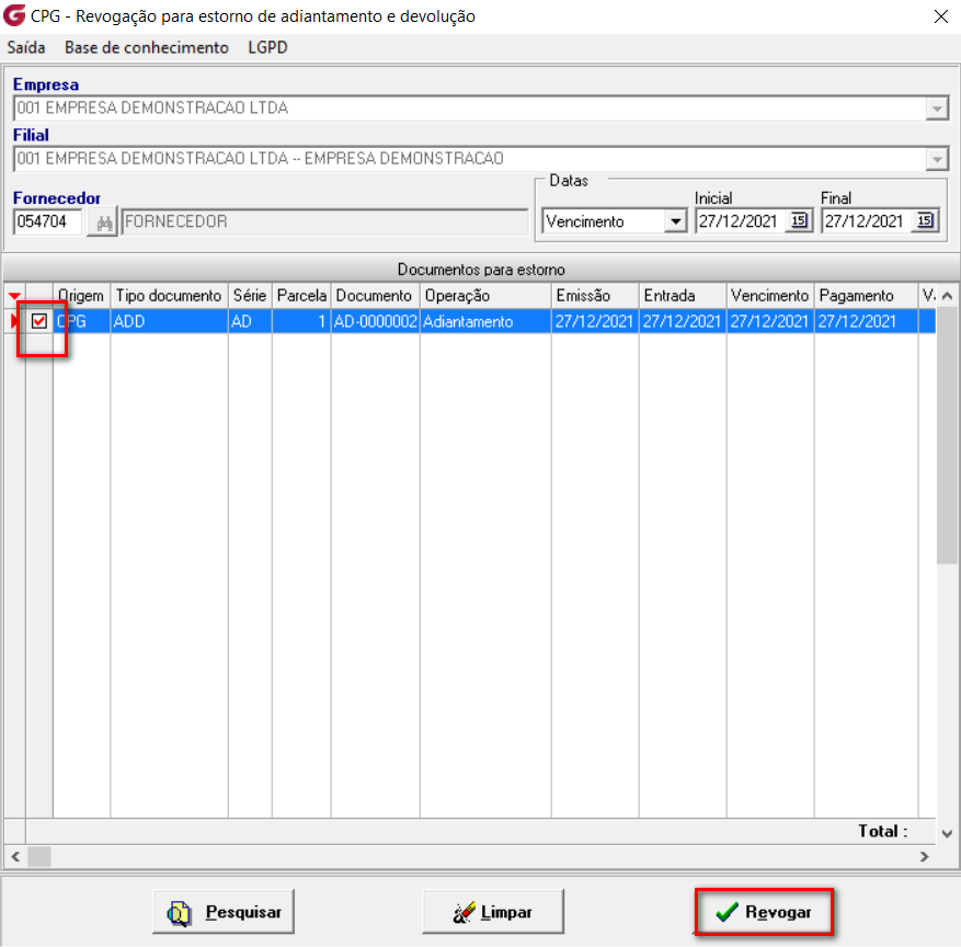 Basta localizar o documento preenchendo os filtros, selecionar ele no grid e clicar no botão revogar. Ao revogar o adiantamento, o documento retorna a ficar ativo no CPG, permitindo assim que o processo seja realizado novamente. No módulo de controle bancário (BCO) o movimento é excluído, com exceção da opção "Utilizar movimento bancário existente", pois esse lançamento é origem do banco.