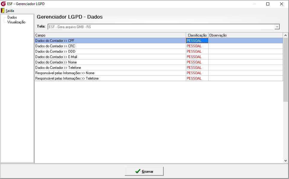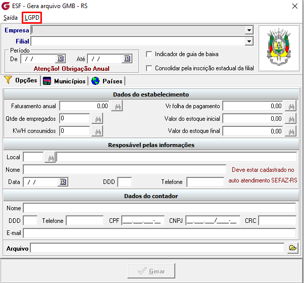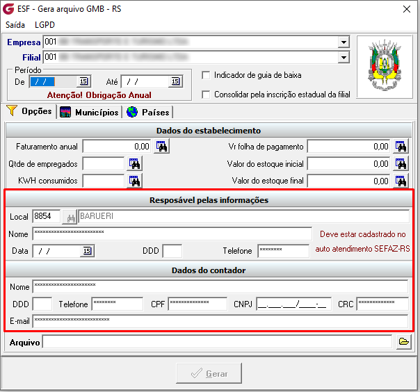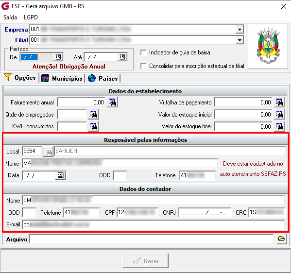 Todos os campos identificados na tela de Gera arquivo GMB - RS como contendo dados pessoais ou sensíveis de Pessoa Física (PF) estarão sujeitos às regras de visualização a partir da data definida no parâmetro 'Ativar a LGPD'. A exibição ou ocultação desses campos dependerá da classificação aplicada no Gerenciador LGPD.